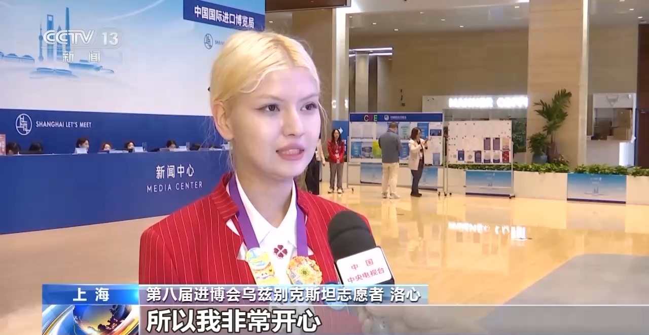 第八届进博会乌兹别克斯坦志愿者 洛心:我第一次参加进博会,我非常开心,我会说英语、中文、俄语和乌兹别克语,所以我常常回答媒体记者的问题。