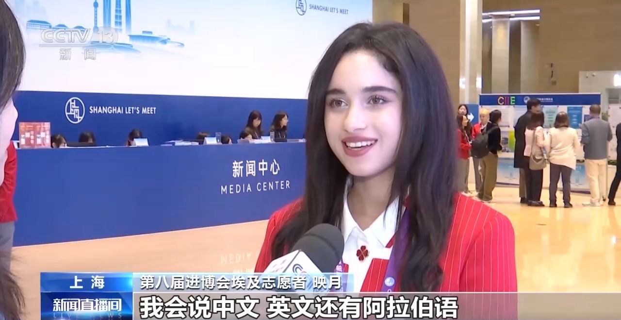 第八届进博会埃及志愿者 映月:我会说中文、英文、阿拉伯语,阿拉伯语是我的母语,我对中国文化非常感兴趣,我觉得参加这样的大型活动是个非常好的机会,让我学习很多事情。