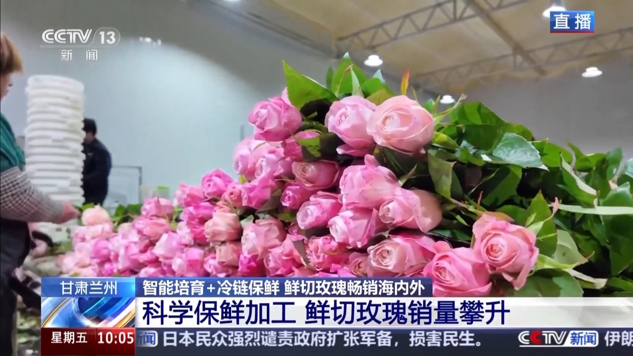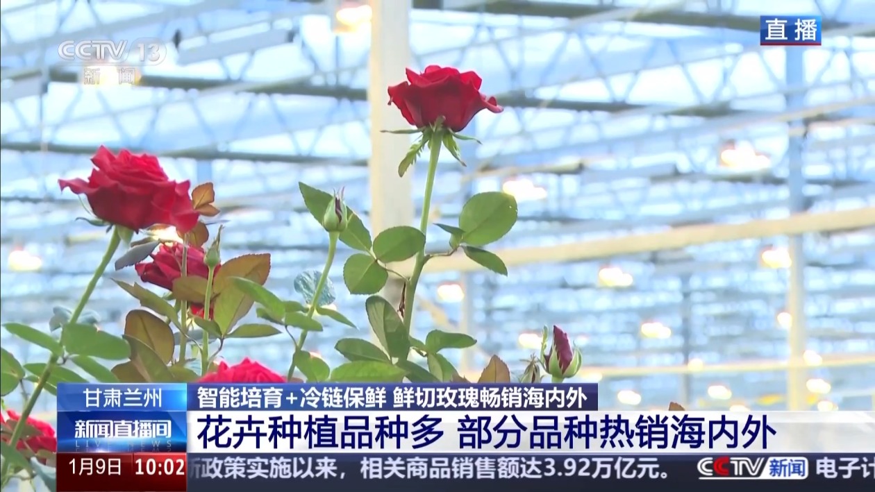 总台记者 崔林欣:在甘肃省兰州新区现代农业示范园花卉产业基地,在我的身旁有一些不同品种的玫瑰花已经开放,各式各样盛放的玫瑰,让整座温室大棚显得非常壮观。兰州新区的花卉智能温室是目前西北地区最大的鲜切玫瑰繁育基地。
