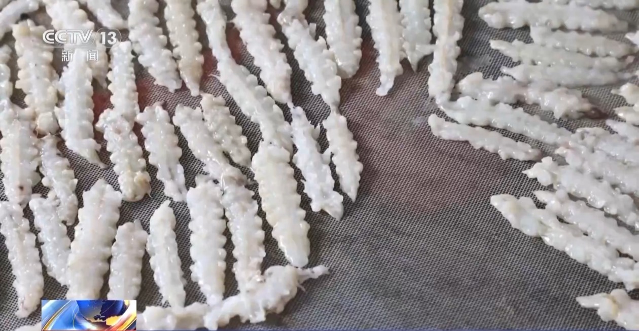 嵛山镇鱼鸟村村民 蔡彩金:头去掉,旁边剪掉,尾巴剪掉,然后再拿到冰箱里面冻一个晚上,拿出来剥才是完整的一个虾蛄干。