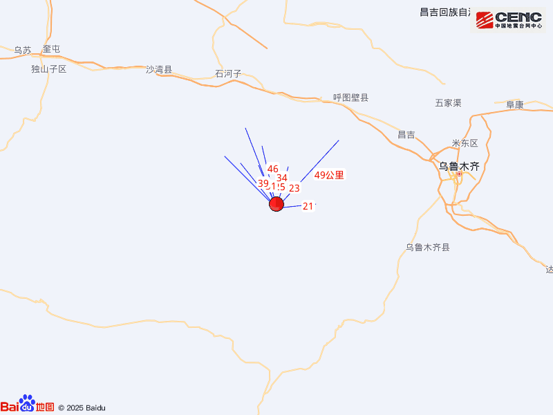 周边县城:震中距呼图壁县68公里、距玛纳斯县70公里、距昌吉市79公里、距头屯河区81公里、距乌鲁木齐县87公里,距石河子市76公里,距乌鲁木齐市99公里。