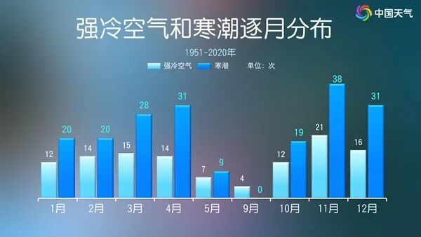 而且从历史逐月统计数据来看,强冷空气和寒潮在11月最为频繁。