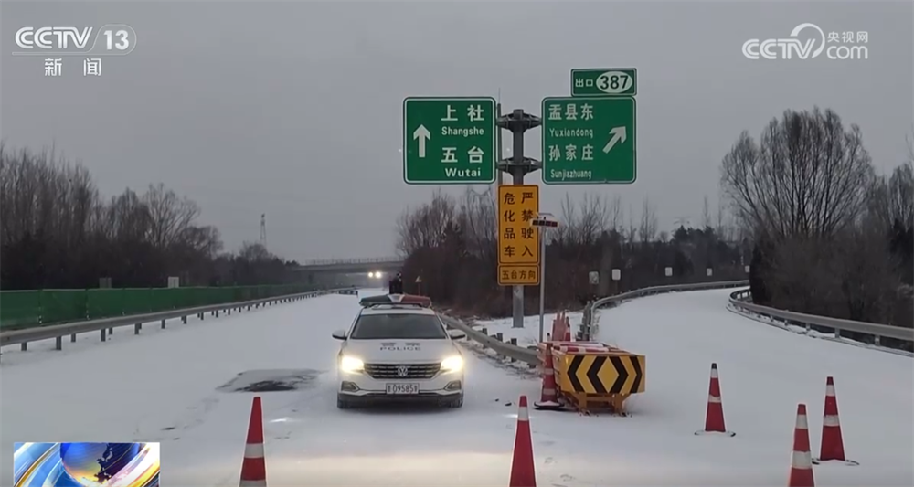 在天黎高速、二广高速、呼北高速、京昆高速等高速部分路段,路面出现积雪结冰,执勤交警在加强巡护管控力度的同时,利用车载喊话和警报设备提醒过往车辆注意安全。