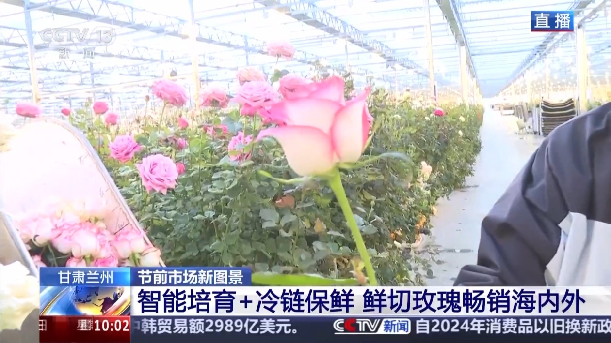 总台记者 崔林欣:在甘肃省兰州新区现代农业示范园花卉产业基地,在我的身旁有一些不同品种的玫瑰花已经开放,各式各样盛放的玫瑰,让整座温室大棚显得非常壮观。兰州新区的花卉智能温室是目前西北地区最大的鲜切玫瑰繁育基地。