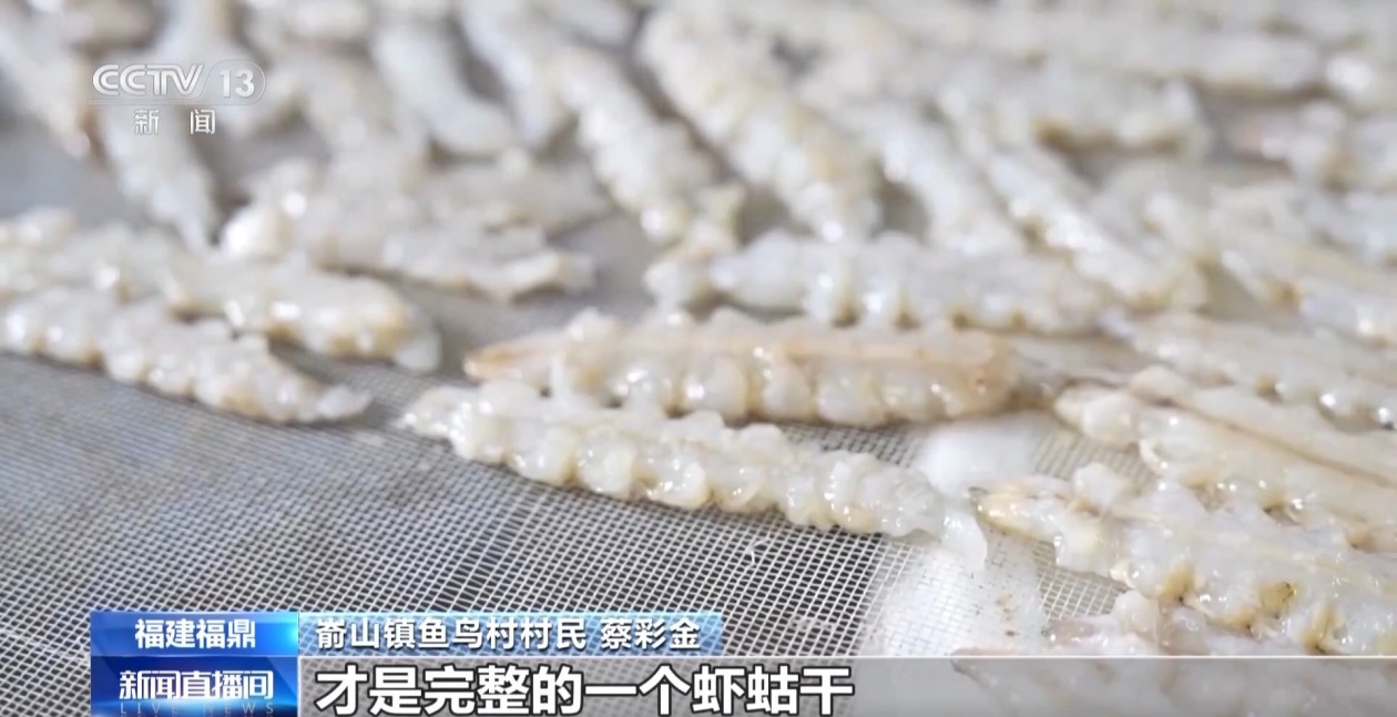嵛山镇鱼鸟村村民 蔡彩金:头去掉,旁边剪掉,尾巴剪掉,然后再拿到冰箱里面冻一个晚上,拿出来剥才是完整的一个虾蛄干。