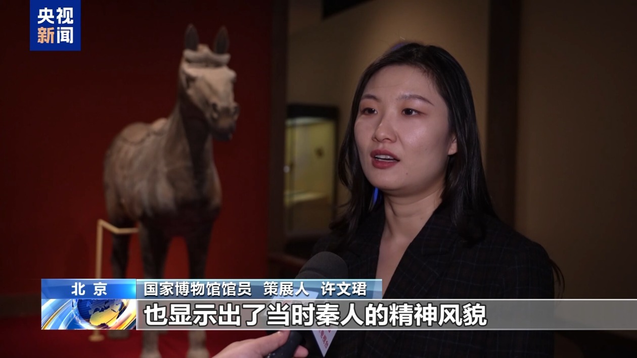 国家博物馆馆员、策展人 许文珺:这一件秦始皇帝陵兵马俑的秦鞍马,双蹄直立,它的耳朵是直立的,尾巴也是梳成一个辫状,整体非常有力量,也是秦代人对战马筛选标准非常严格的体现,也显示出了当时秦人的一个精神风貌。