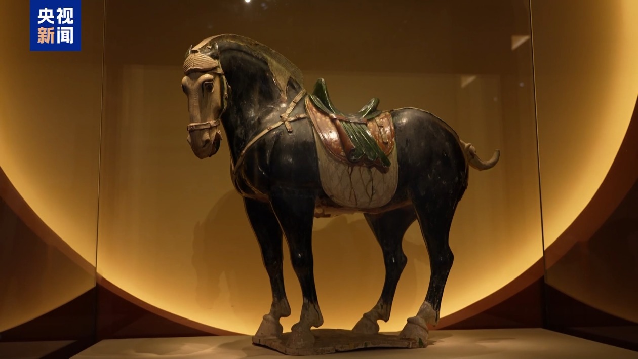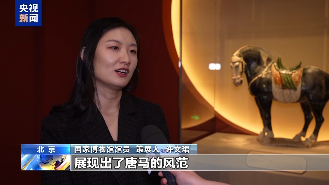国家博物馆馆员、策展人 许文珺:它一改汉代时期古拙平稳的风格,展现出了唐马的风范。它是唐三彩中难得的一件黑釉精品,也是我们国博的镇馆之宝之一。