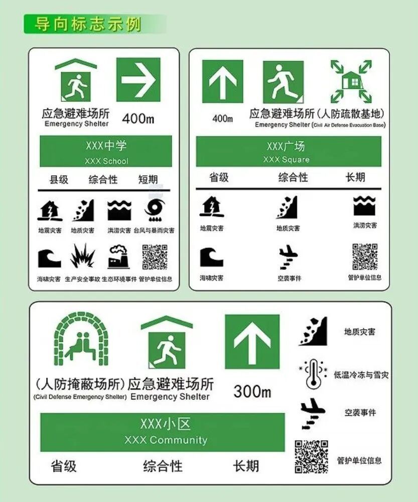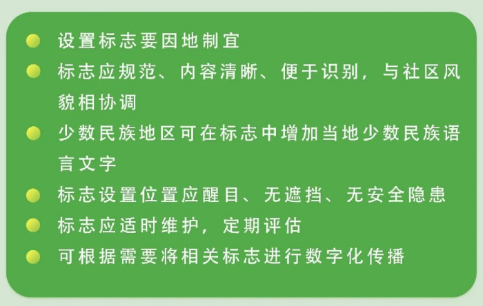 标志设置位置要醒目,充分利用社区空间合理布局;同时导向标志、警告标志、应急避难场所标志等关键标志,要采取照明、反光或自发光等方式,使标志夜间可视,确保居民能看到。