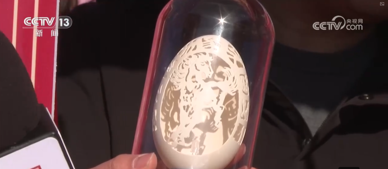 看完表演,再来逛逛好玩的展销区。这里的年货种类丰富,特色鲜明。首先是怀仁陶瓷展区,怀仁陶瓷主要是日用瓷具,也就是日常使用的勺、碗、盘、碟等,此外还有精致美观的陶瓷摆件。旁边这个展台是蛋雕,手艺人在薄薄的鸡蛋壳上精雕细琢,特别考验手艺人的功底,力度轻重、明暗层次都要拿捏精准。