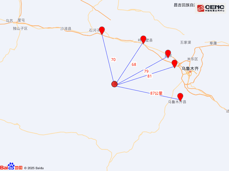 周边县城:震中距呼图壁县68公里、距玛纳斯县70公里、距昌吉市79公里、距头屯河区81公里、距乌鲁木齐县87公里,距石河子市76公里,距乌鲁木齐市99公里。