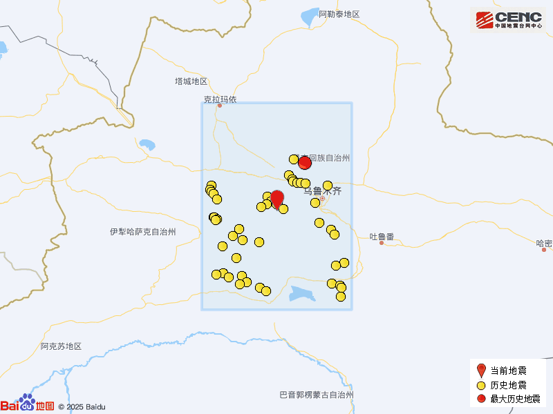 历史地震:根据中国地震台网速报目录,震中周边200公里内近5年来发生3级以上地震共62次,最大地震分别是2026年3月7日在新疆昌吉州呼图壁县发生的4.8级地震(距离本次震中NAN公里)和2022年7月20日在新疆昌吉州昌吉市发生的4.8级地震(距离本次震中106公里),按震级大小前50次历史地震分布如图。