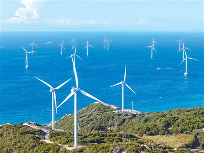 福建省平潭综合实验区聚焦风电产业发展,利用海面风能资源丰富的优势,打造“绿色能源+海上牧场”互补模式,输送绿色电能,助力低碳减排。图为平潭综合实验区苏平片区北部湾海域,风力发电机迎风转动。谢贵明摄(人民视觉)