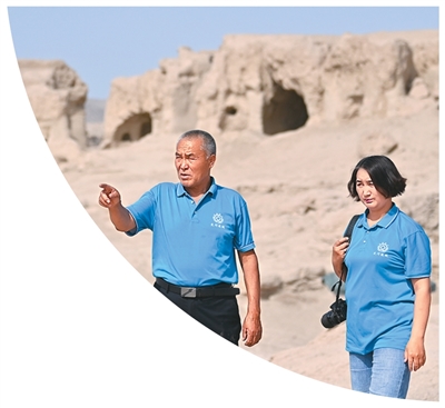 古丽拜克热·买明(右)与父亲在巡护交河故城。新华社记者 李响摄