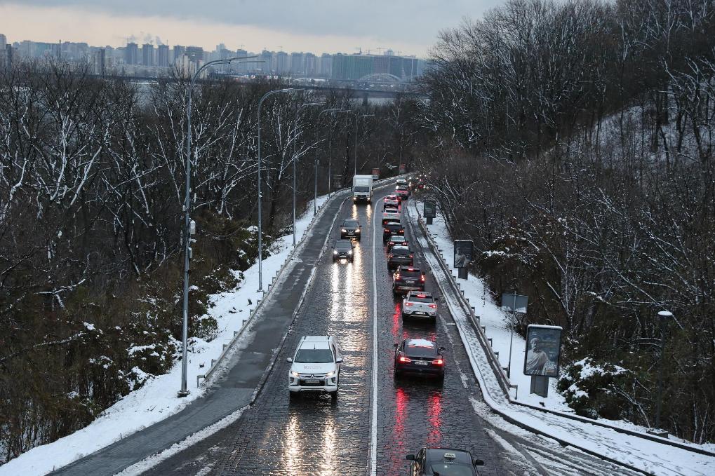 这是2024年11月21日拍摄的白雪映衬下的乌克兰首都基辅右岸沿河公路。新华社记者李东旭摄