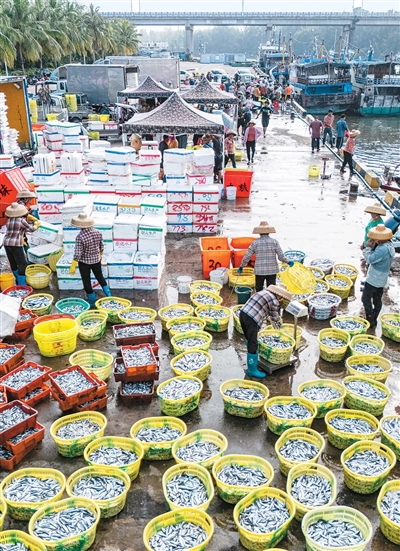 近日,在海南省琼海市潭门中心渔港,渔民在码头装卸渔获。