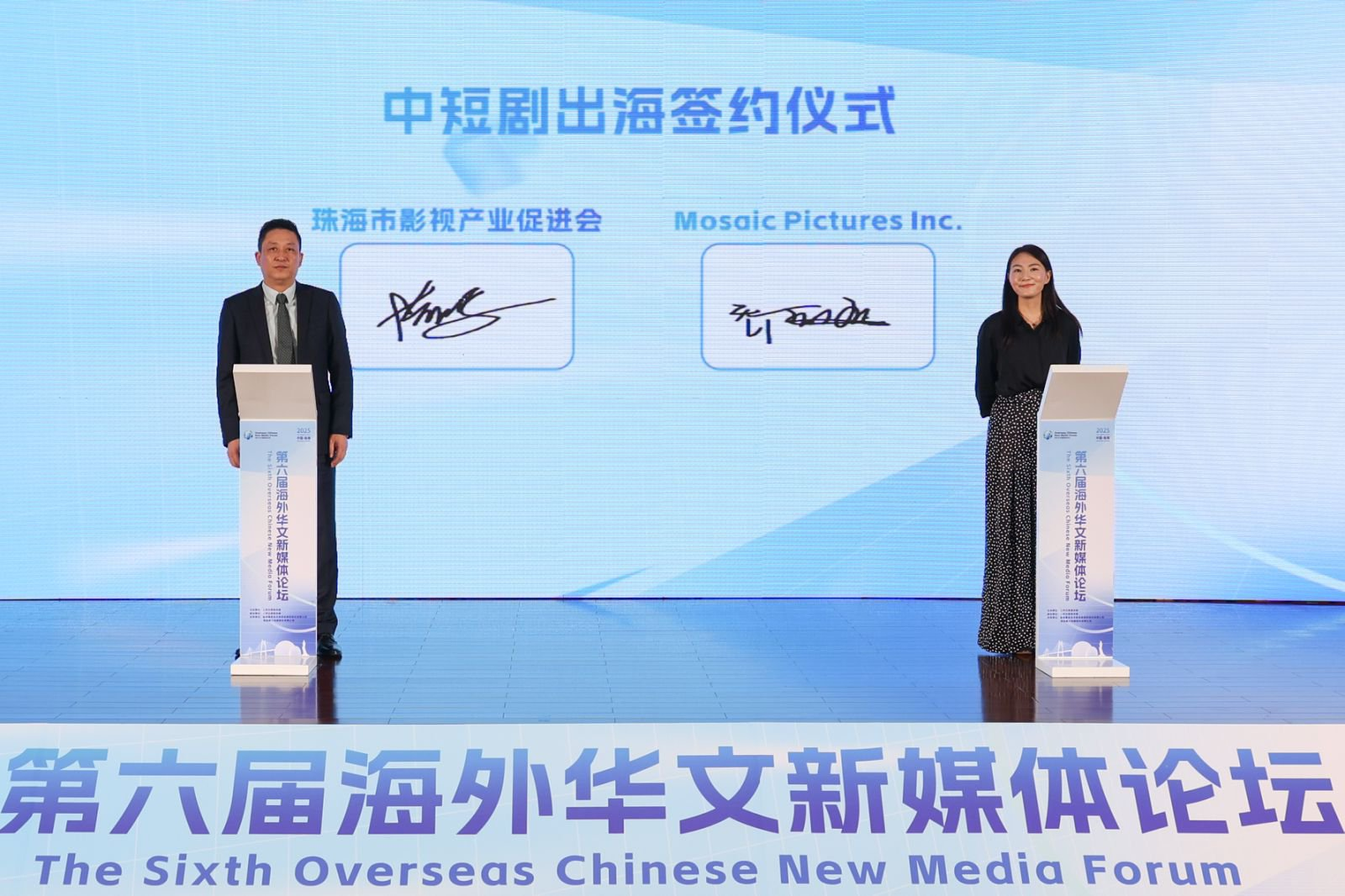 分论坛结束前,还举行了珠海故事·影视短剧出海签约仪式。珠海市影视产业促进会副会长周泠浔与美国Mosaic影视制作公司总经理乔珊珊签署合作协议,双方将整合优质资源,共同打造具有国际影响力的短剧内容,推动中国文化高质量出海。