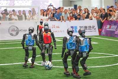 2025世界智能产业博览会期间的机器人3V3足球赛。