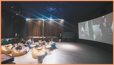 浙江省杭州市富阳区银湖街道合之舍书房影视厅内,附近的居民在观看电影。