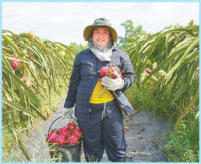 8月,位于老挝万象的中国—老挝合作农作物优良品种试验站火龙果示范基地,农户感受丰收的喜悦。