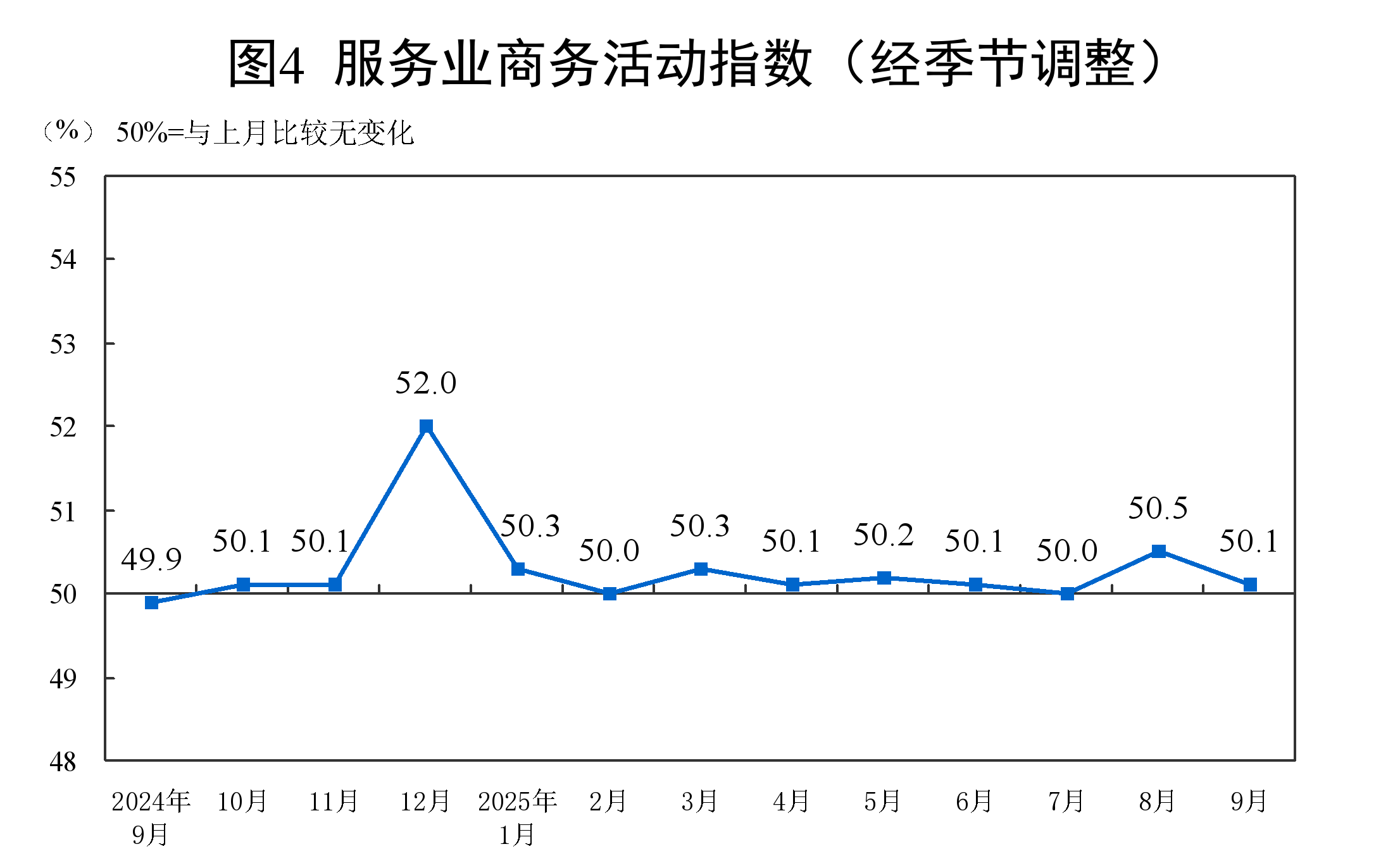 9月份,非制造业商务活动指数为50.0%,比上月下降0.3个百分点,位于临界点,非制造业业务总量总体稳定。