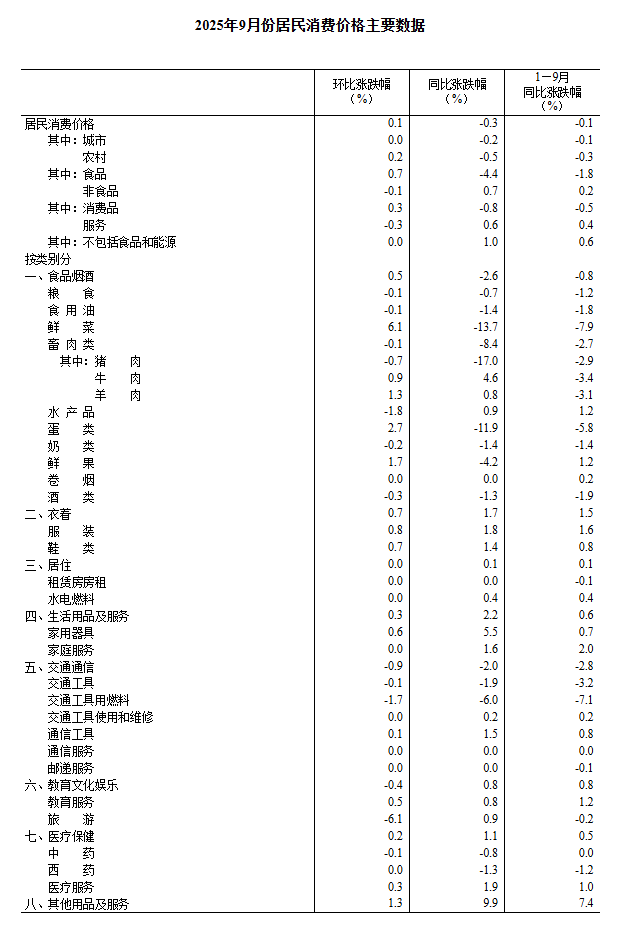 2025年9月份居民消费价格同比下降0.3% 环比上涨0.1%