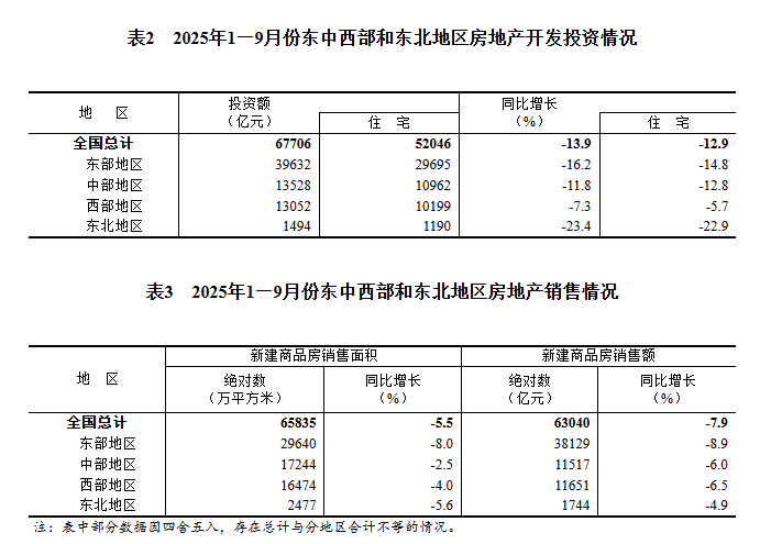 1-9月份,新建商品房销售面积65835万平方米,同比下降5.5%;其中住宅销售面积下降5.6%。新建商品房销售额63040亿元,下降7.9%;其中住宅销售额下降7.6%。
