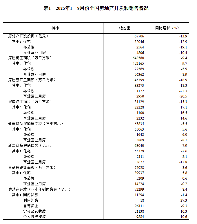 1-9月份,房地产开发企业房屋施工面积648580万平方米,同比下降9.4%。其中,住宅施工面积452165万平方米,下降9.7%。房屋新开工面积45399万平方米,下降18.9%。其中,住宅新开工面积33273万平方米,下降18.3%。房屋竣工面积31129万平方米,下降15.3%。其中,住宅竣工面积22228万平方米,下降17.1%。