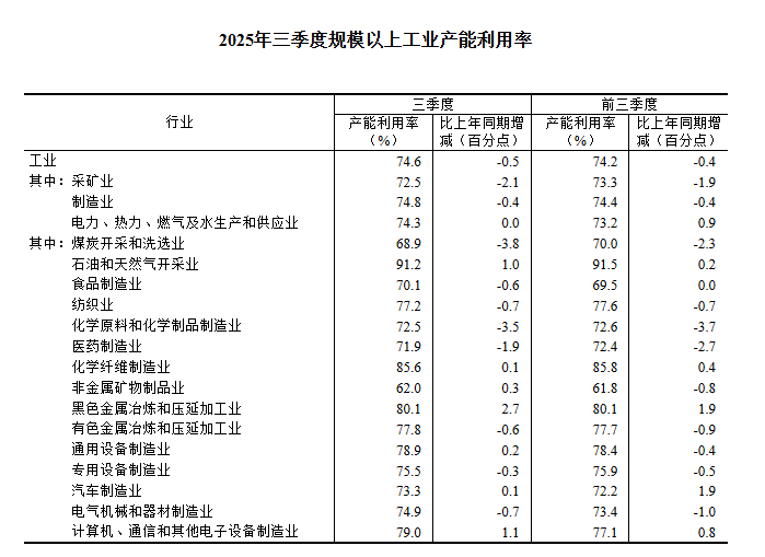 分主要行业看,2025年三季度,煤炭开采和洗选业产能利用率为68.9%,食品制造业为70.1%,纺织业为77.2%,化学原料和化学制品制造业为72.5%,非金属矿物制品业为62.0%,黑色金属冶炼和压延加工业为80.1%,有色金属冶炼和压延加工业为77.8%,通用设备制造业为78.9%,专用设备制造业为75.5%,汽车制造业为73.3%,电气机械和器材制造业为74.9%,计算机、通信和其他电子设备制造业为79.0%。