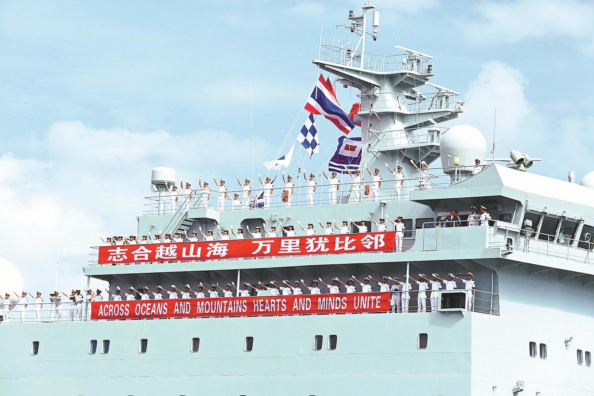 戚继光舰官兵在泰国梭桃邑港向民众致意。新华社发