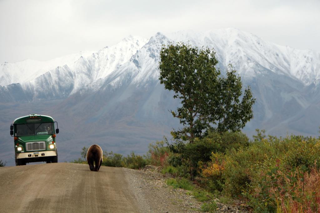 2013年8月29日,在美国阿拉斯加州的迪纳利国家公园,一头棕熊和一辆载着游客的观光巴士在路上不期而遇。新华社记者段卓力摄